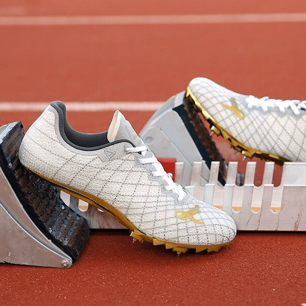 The most unique thing about sprinting spikes is that they offer almost zero heel support in order to be more lightweight. That's great for running slightly faster when every millisecond counts, but can be a contributor to injury if you do a lot of running and jumping in these. Another major feature is the angle. Spikes are slightly angled to make it more natural to run with proper running technique on the balls of your feet. The sharper the angle, the more it was designed for sprinting and the worse it is for jogging. Finally, the hard spike plate tends to stretch the entire distance of the shoe. This allows for more power transfer into the track.